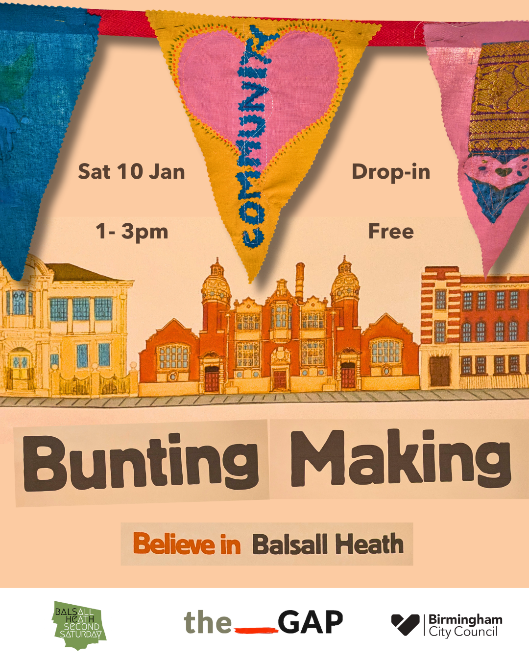 Join us at The GAP to make your own piece of bunting inspired by Balsall Heath using paint, fabric, vinyl and more. Your artwork will be added to a metres-long bunting piece created collectively over the next several months as part of the Believe in Balsall Heath project. Once finished, it will be displayed on the streets nearby to celebrate and decorate our beloved neighbourhood.